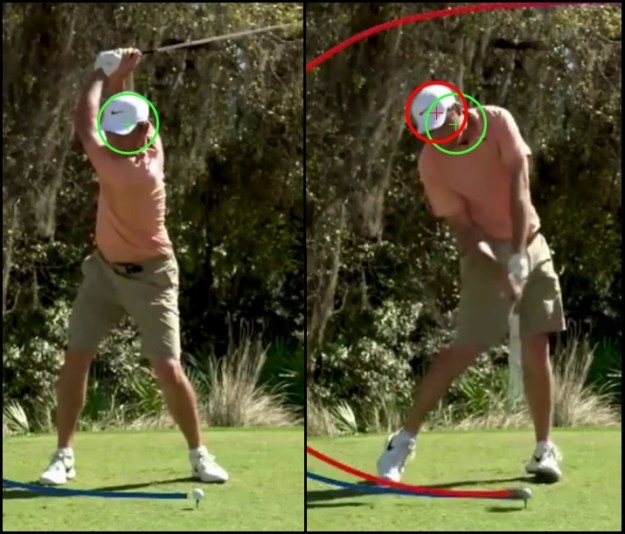 Scottie is pretty stuck in an undesirable position at the top – too much weight to the left side, head in the middle of the stance instead of the right side, so now he’s got get that head more to the right, and it actually comes up (back and down not so bad, back and up not good at all, mechanically) to get to a good impact position.