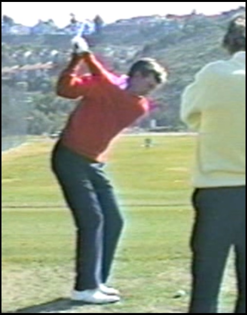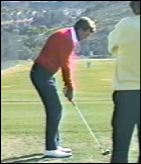 … that setup is nearly perfect, but for one thing – Al has a good deal of squat flex in the legs standing over the ball, which would restrict his ability to make a clean hip turn and would interfere with the straightening of the right leg on the back pivot: