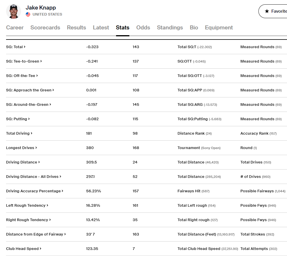 As you will see with a glance at his stats, he is a long driver (7th last season in avg club speed and 24th in avg driving distance) but horrifically inconsistent with these mechanics – a shade over 52% fairways, ranking 162nd, and the other stats are shocking (186th in Total Driving Efficiency), for a player with 1 Tour win and having just booked a 59 score.