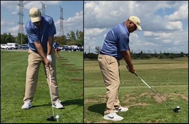 The ’15 setup had two issues – a slightly-over-wide stance and another issue that comprised of two components – a right hand grip that is far too strong (that’s a long drive type of grip) which is actually caused by the fact that I was swinging left-dominant.
