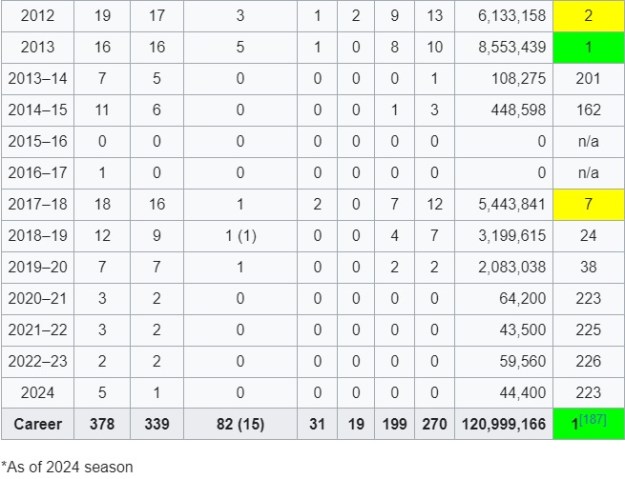 … in the ten years since, he’s had only had three seasons where he played more than 5 times, one of them being 7 and the other two, 18 and 12.
