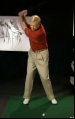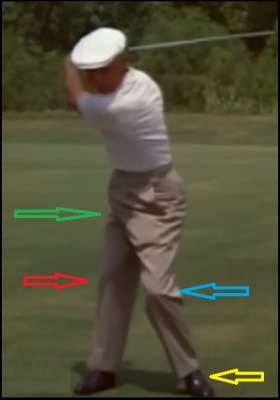 - The narrator then at 1:30 goes completely off the rails, saying “the right knee stays put, but does flex somewhat on the back swing to accommodate the sitting position at the top of the swing. His weight transfer is accomplished to the right side, by turning the upper body.”