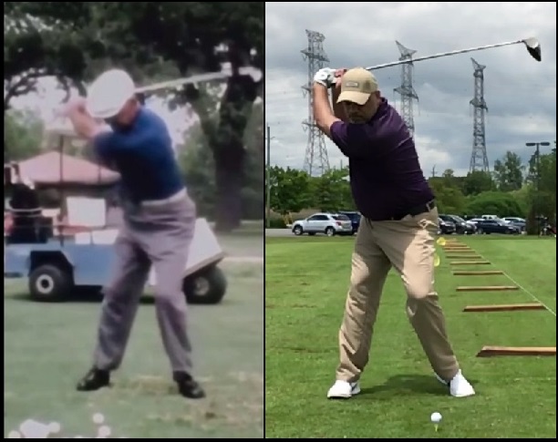 I feel like I’m shooting a fish in a barrel here, but once again, his “Hogan” swing beside Hogan at the top: