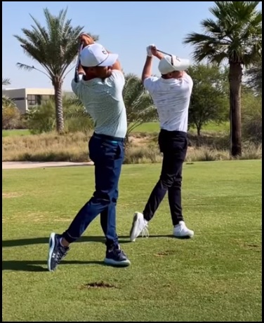 … then it fairly leaps out at you when you’re watching swings on YouTube – everyone is stuck on or shifts into their leading foot on the back pivot, which allows a hip turn now, but leaves you hopelessly stuck trying to come back down to the ball.
