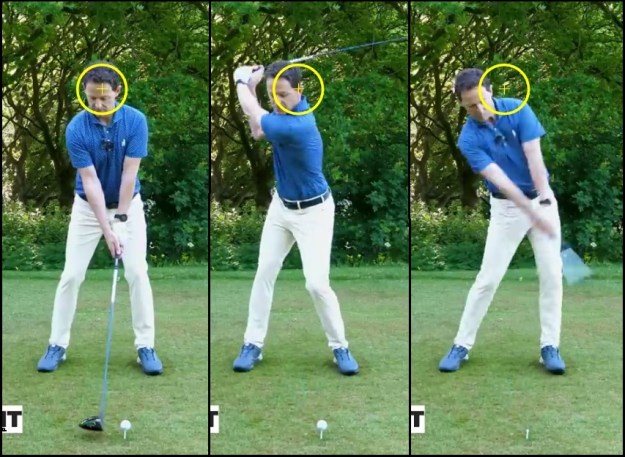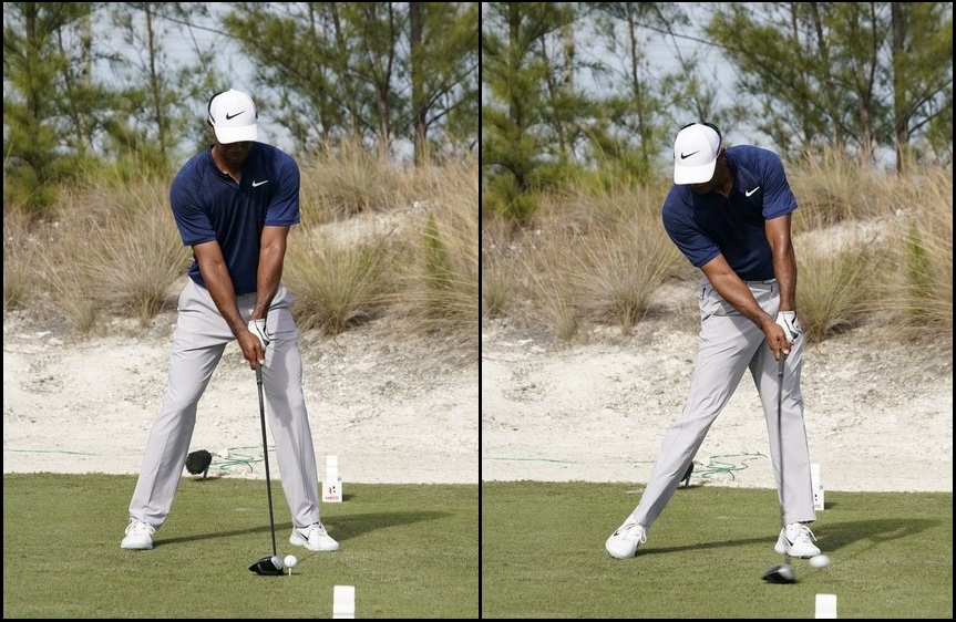 This is how Tiger Woods kept damaging his back, by the way, from the Sean Foley days to present – setting up left of his impact position with the head and then violently changing direction at the top to get behind the ball: