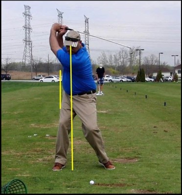Here’s the problem – the swinger is set up with his weight already way to his left, so of course, to pivot to the top with his head over the right side, he would have to shift.