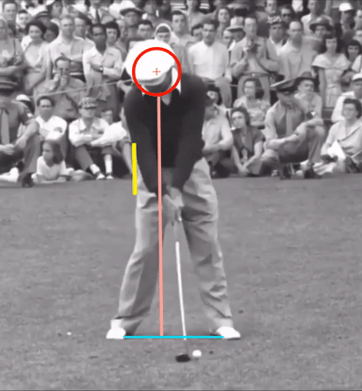 2. Hogan pivoted over his right side and even shifted to the right with his head, whilst keeping the hip from crossing the vertical plane (no shift of the hips to the right). So when he talked about “bracing his right leg against shifting to the right,” he meant exactly that, and not restricting the hip turn or his left heel lift in any way.