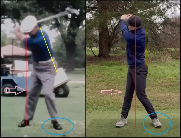 And all of this, people, comes from the #3 comparison – all of this mish-mash and dreck Modern Golf Swing idiocy because the leading heel is being nailed down for the back pivot.