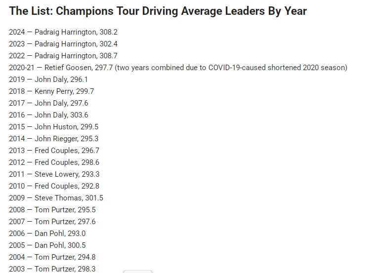 If you look at the driving leaders the last two decades for the Champions Tour on Golf Compendium: