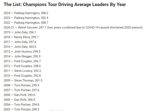 That might not sound like a lot of players given the average driving distance for all of the PGA Tour is 303.7 yards, but relatively-speaking, it is. Consider that before 2023, the Champions tour never had had more than one player crack 300 yards for the season — and, in most seasons, none. The overall Champions tour driving distance, no surprise, is also on the rise.